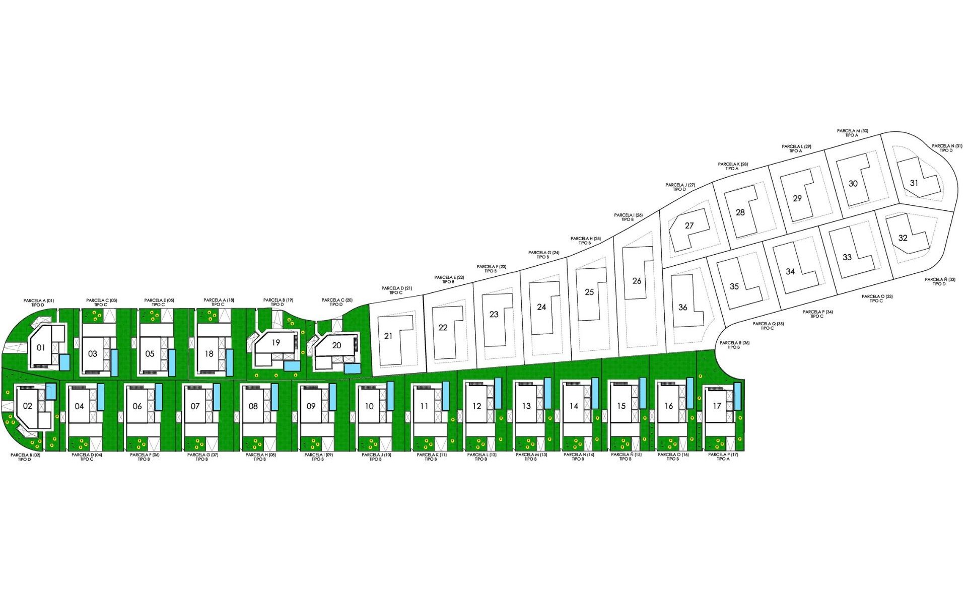 Le rez-de-chaussée comprend une ou deux chambres supplémentaires avec salle de bains attenante, des toilettes pour invités et une cuisine ouverte reliée au salon et à la salle à manger, avec accès direct à la terrasse et à la piscine. Un solarium sur le toit couronne chaque propriété, offrant une vue panoramique sur la montagne ou la mer et la possibilité d'installer un jacuzzi.