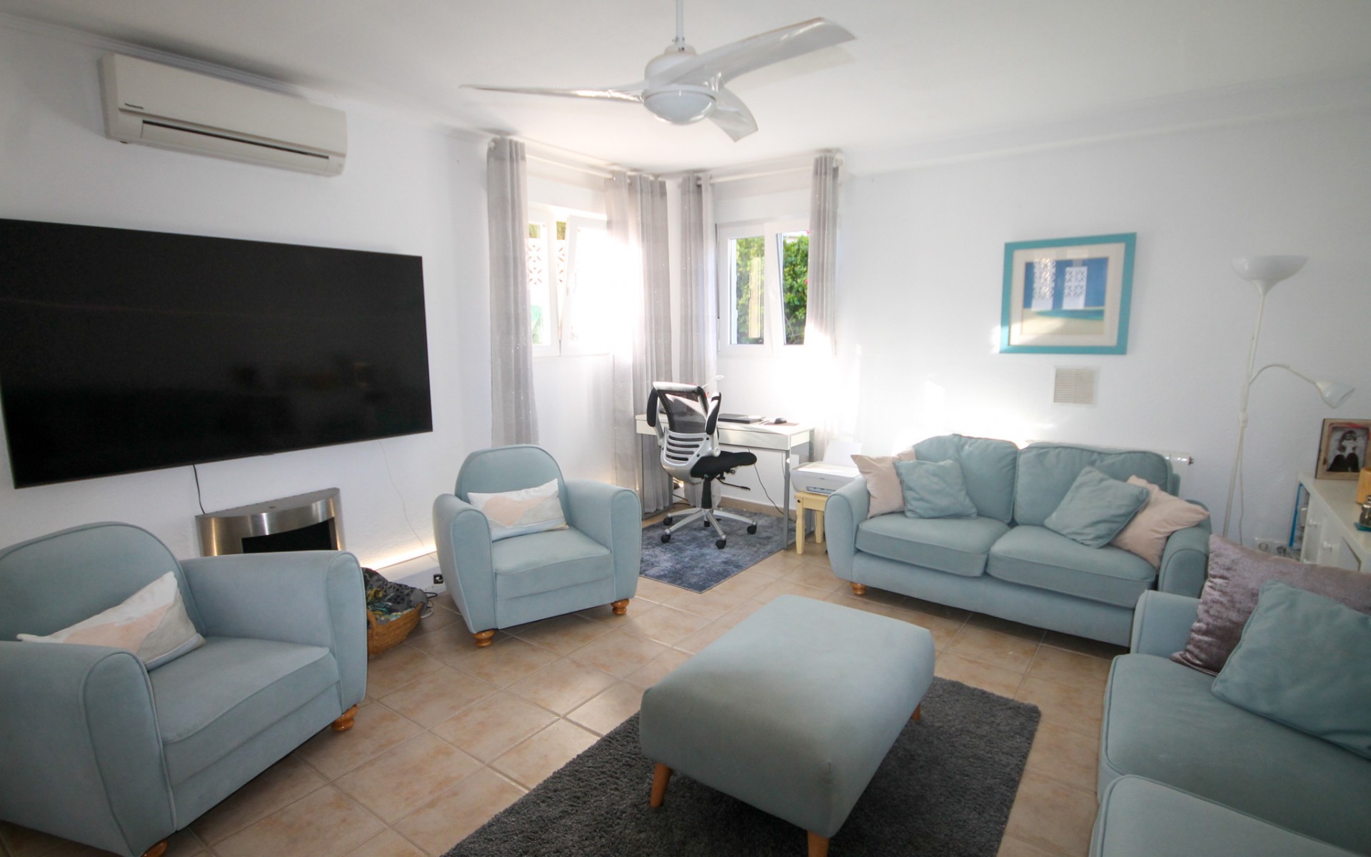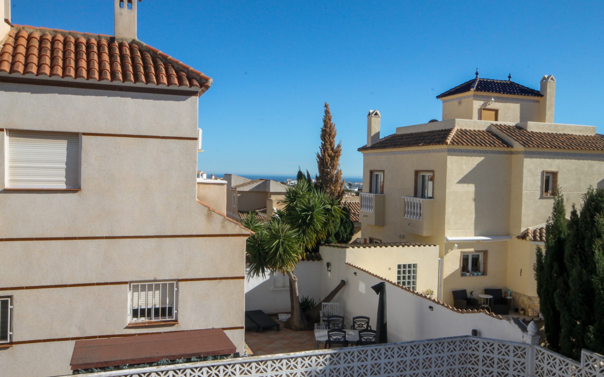 Steps from the garden lead up to the main living area with a lounge diner and modern kitchen adjacent. There is a shower room and two double bedrooms with fitted wardrobes, the master having an en-suite bathroom and patio doors onto the balcony. From the lounge there are also patio doors which open out onto a large, south facing balcony with lovely sea views and overlooking the pool area. Stairs from the balcony lead down to the pool and the entrance into the ground floor apartment. Here there is a fabulous modern kitchen, a shower room, a spacious lounge, a double bedroom and a room also being used as the fourth bedroom. Outside, and to the front, the generous plot has off road parking and a lovely established garden with a sunken area for a fire pit. To the side, there is a utility room and patio area with a large outside kitchen and bar, ideal for summer evening barbeques. To the rear, there is the large swimming pool with plenty of space for the patio furniture in this lovely sunny spot. The villa also benefits from air conditioning, internet, mains gas central heating, an alarm and is to be sold part furnished. Only 10 minutes drive to the local beaches on the Orihuela Costa, and walking distance to amenities. Viewing recommended! No Community fees. Suma: 379€ pa