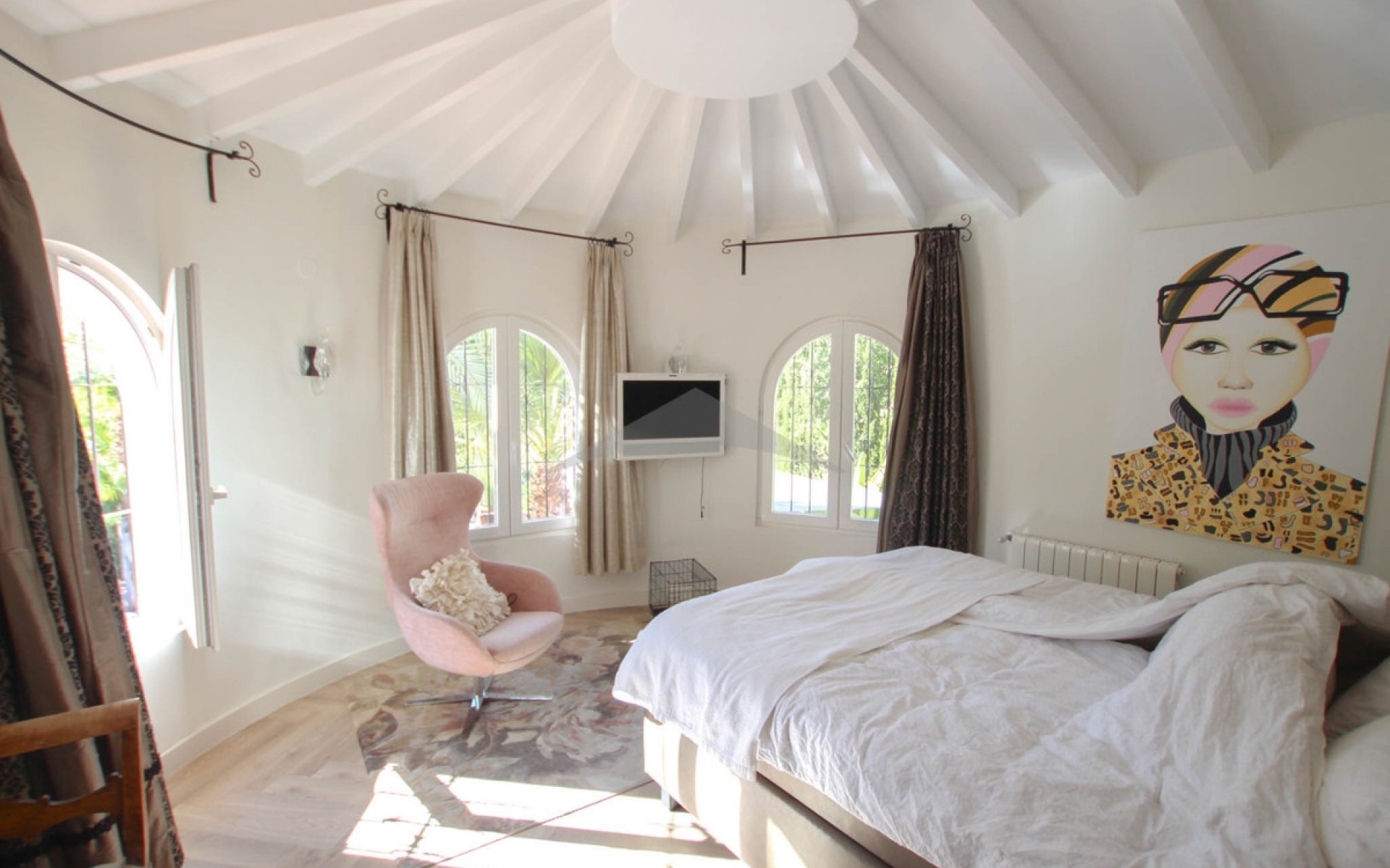 Spacious villa overlooking the Golf course in San Jaime, Benissa. Beautiful huge villa with views of the San Jaime golf course and a small sea view, privately situated in San Jaime. The property consists of a main residence and an apartment. The villa comprises a living room, dining room, equipped kitchen, 3 bedrooms, 2 bathrooms (1 of which is en suite), 2 guest toilets, storage/laundry room. The apartment has its own entrance, a combined living/dining room, kitchen, bedroom, and bathroom.