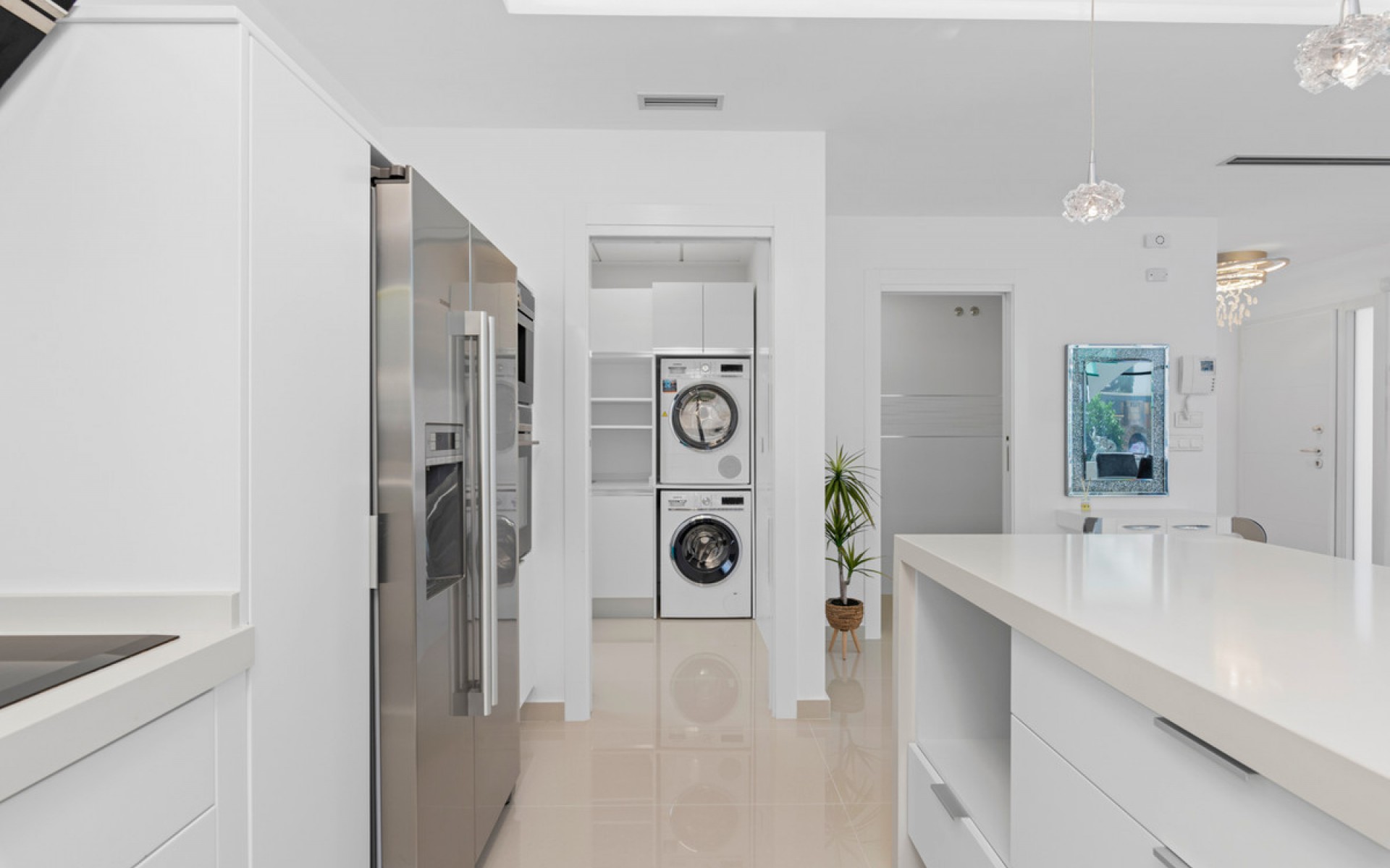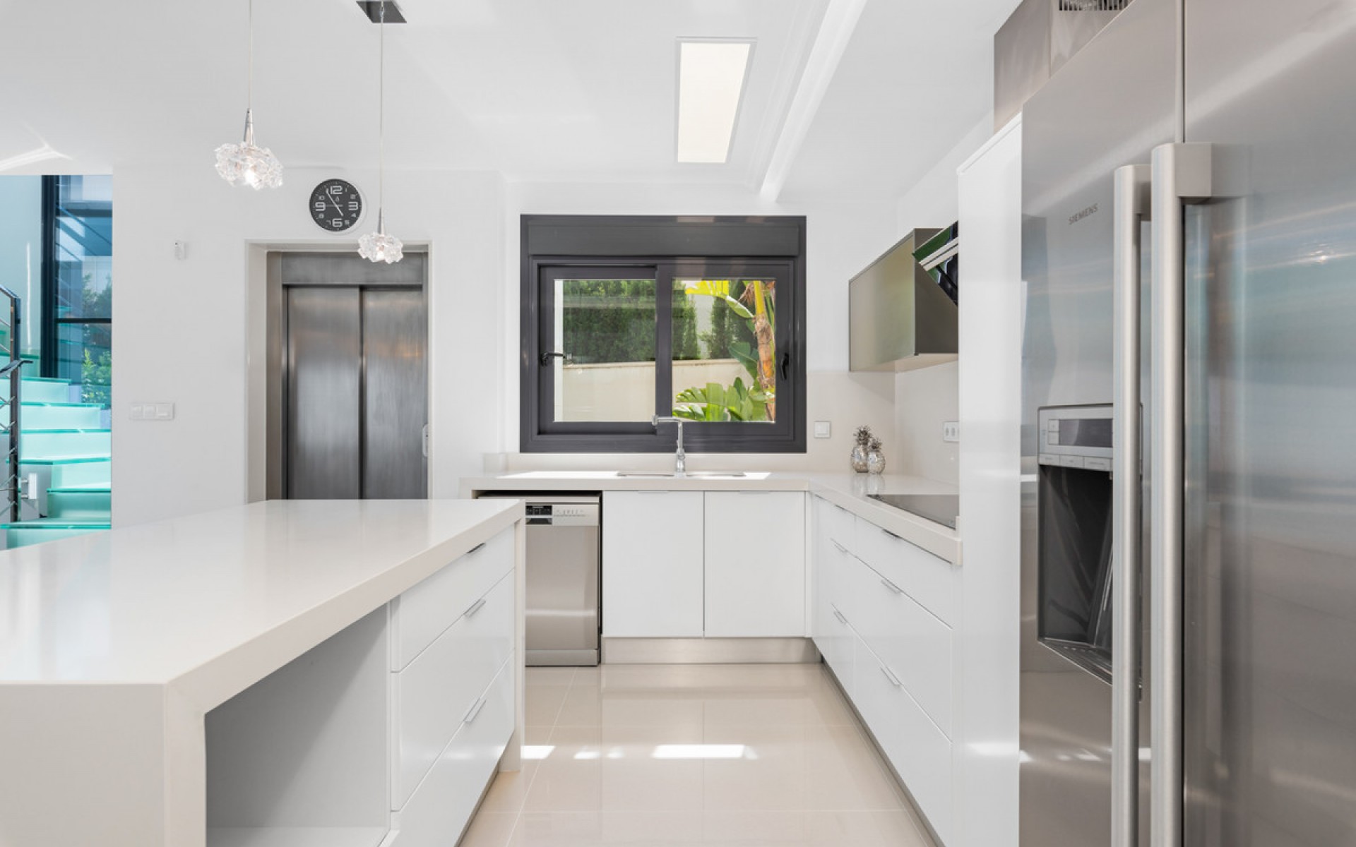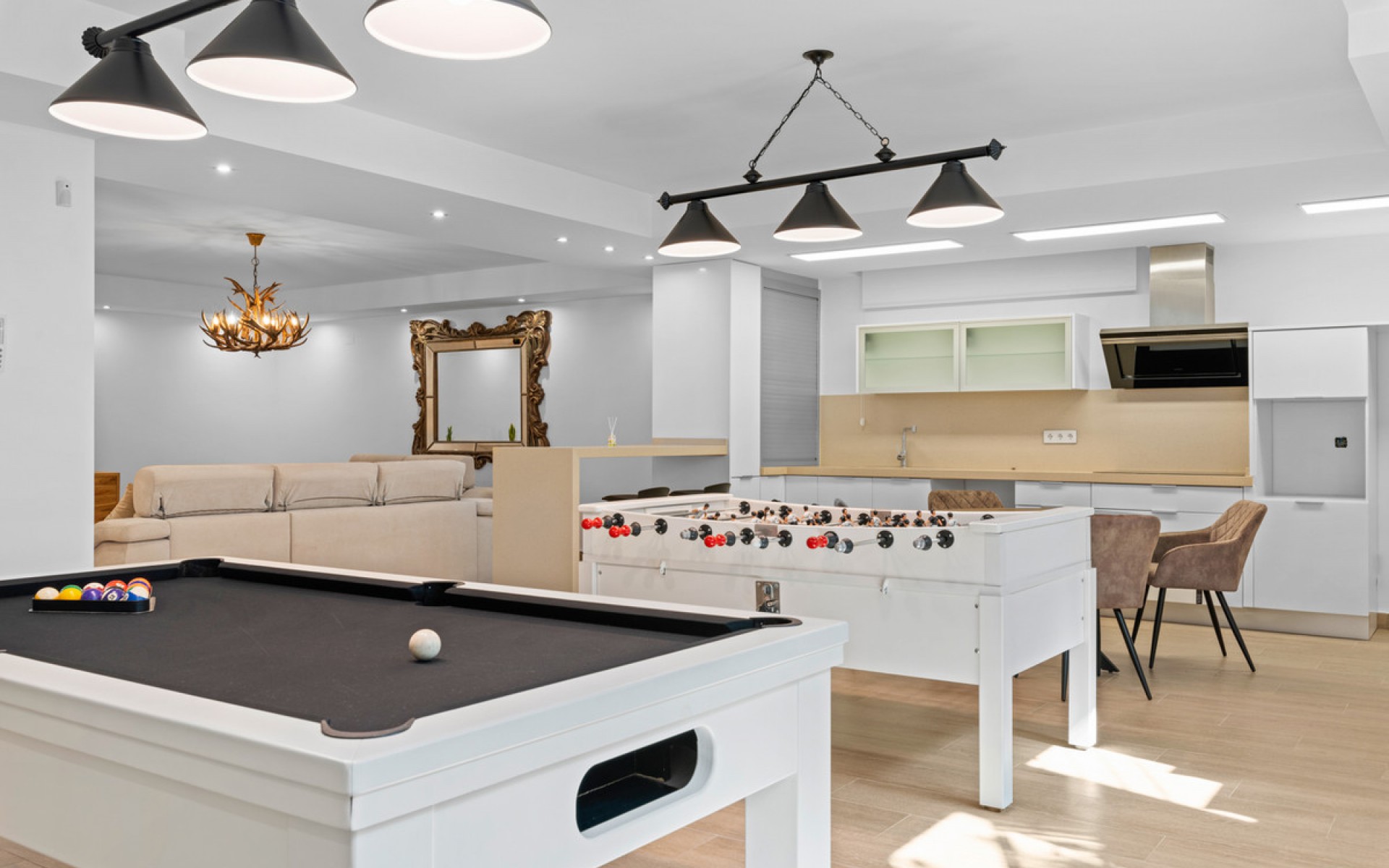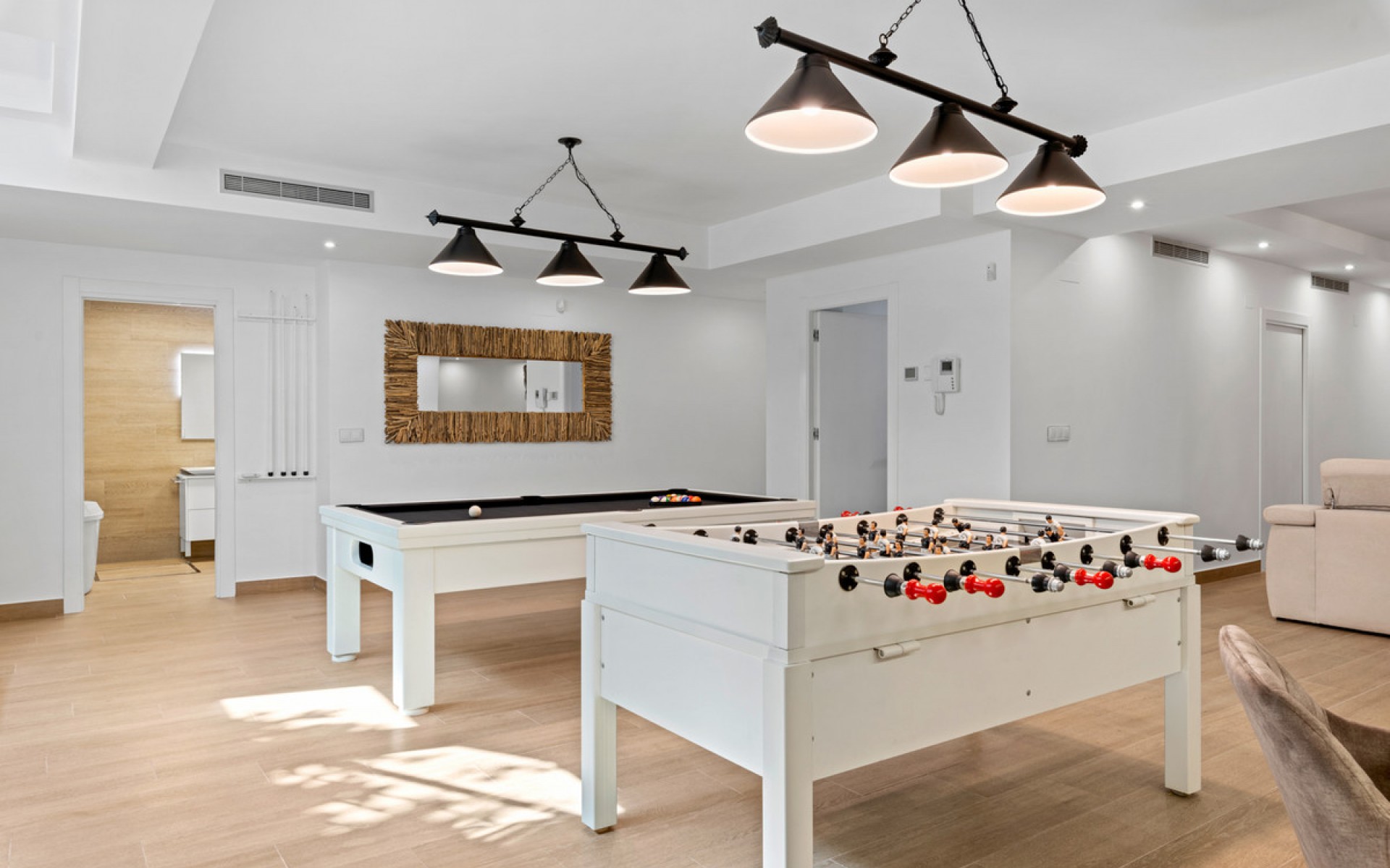 This recently built luxury property has a total of 5 bedrooms and 4 bathrooms, distributed over two floors and a basement, with a practical elevator that communicates with all the floors of the house and a beautiful glass staircase with interior lighting. In the basement we find a game room (with billiards and table football), a room for celebrations with a full kitchen, 2 bedrooms, 2 storage rooms and a full bathroom. On the main floor we find the living-dining room with an open-concept kitchen and central island, the main bedroom with an en-suite bathroom, as well as a laundry room and a toilet. On the first floor there are 2 spacious bedrooms, 2 bathrooms and access to the balconies. On the top floor we find an incredible 70m2 solarium with impressive panoramic views.