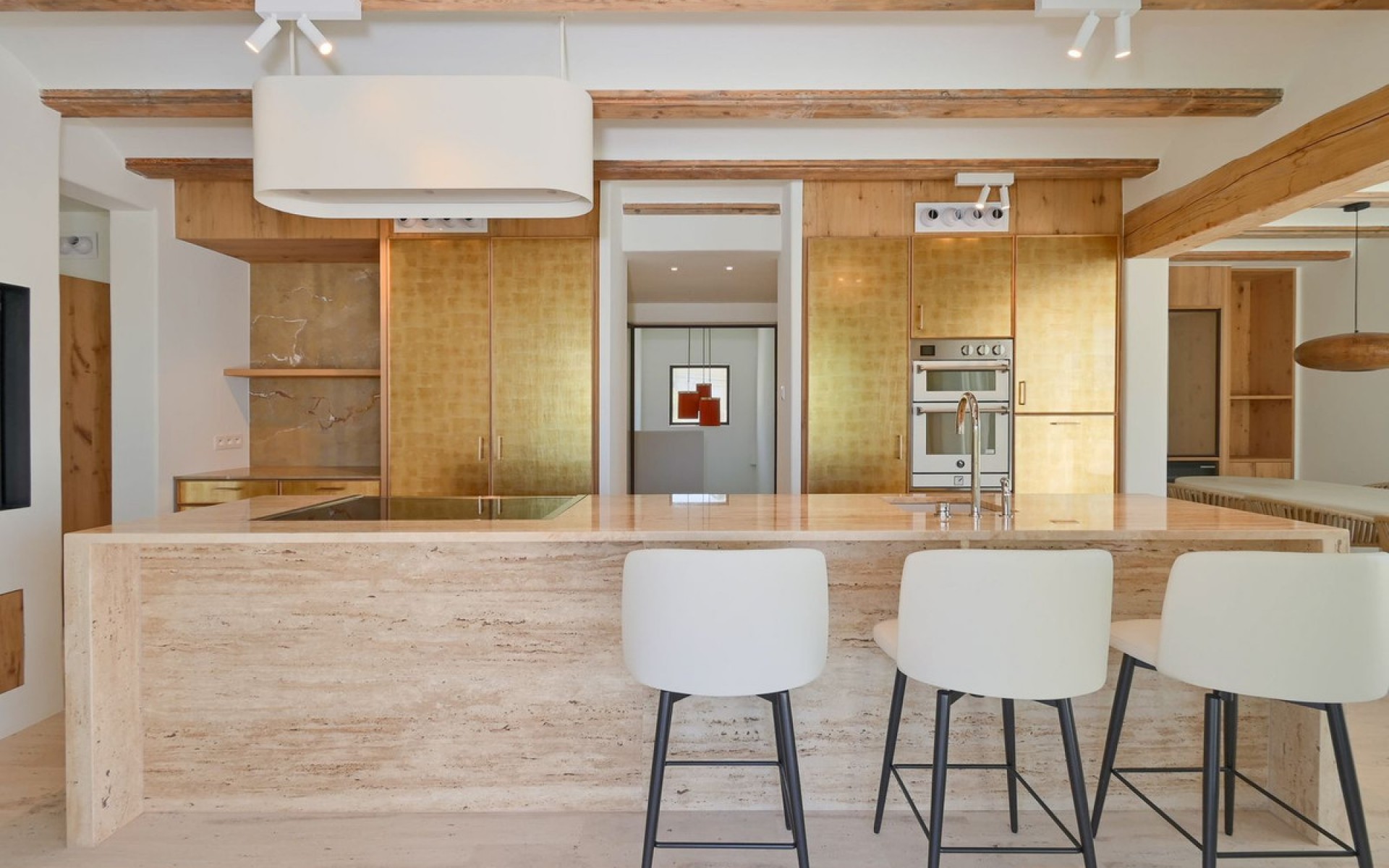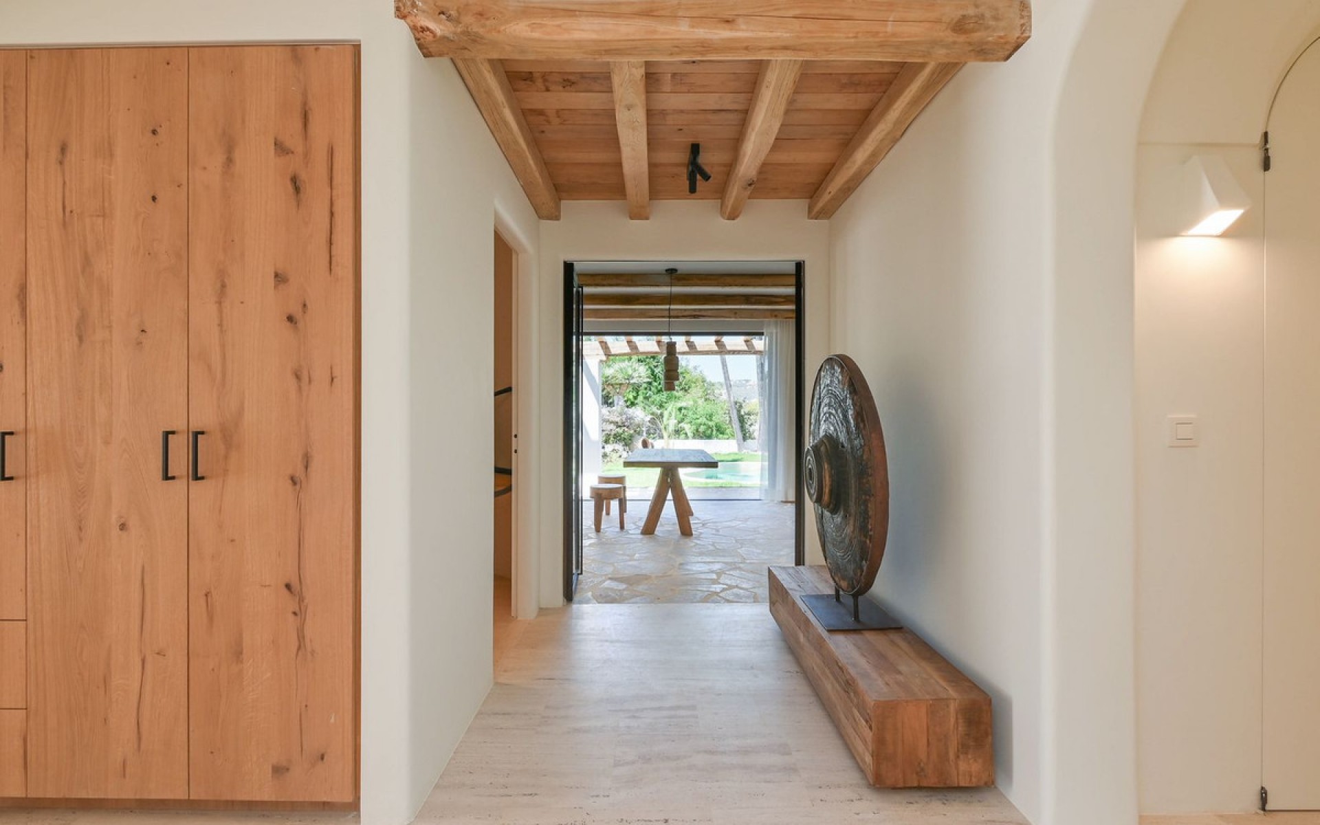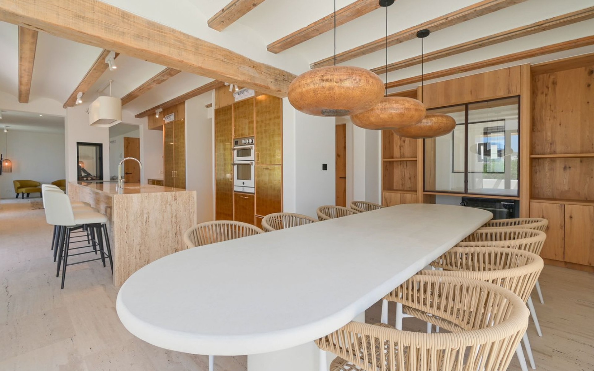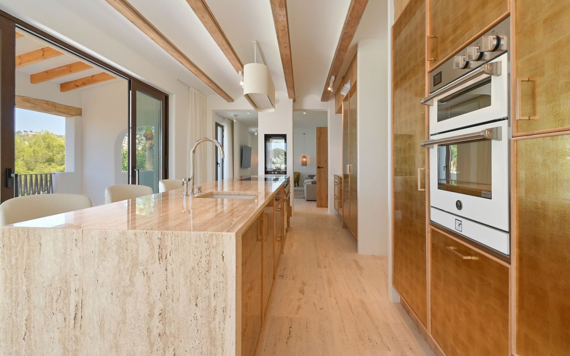 Exquisite Mediterranean Villa – A Vision of Luxury and Innovation Nestled in the prestigious enclave of San Jaime, this meticulously renovated Mediterranean villa redefines high-end living. Designed under the expert eye of Belgian interior designer Bart de Beule, every element of this home exudes sophistication and timeless elegance. Set within walking distance of the sea, fine dining, designer boutiques, and essential amenities, this exceptional property offers a seamless blend of convenience and exclusivity. Just moments from the renowned Moraira Golf Course, it boasts breathtaking views of the Mediterranean and the iconic Peñón de Ifach. Inside, the villa is a masterpiece of craftsmanship, featuring oak custom-made furniture, travertine flooring, and a polished ice-cellar stone finish. The fully insulated structure is designed for future-proof sustainability, equipped with solar panels (5KW), a heat pump, and a state-of-the-art ventilation system. Unparalleled Comfort & Design Five luxurious en-suite bedrooms, each with walk-in showers designed to feel like standing on soft, wet sand, antibacterial and anti-slip surfaces, and ceilings finished in Sabina wood. The master suite offers a freestanding bathtub and customizable mood lighting for a spa-like experience. A dedicated office space, featuring custom oak cabinetry, a hidden printer station, and designer lighting by a renowned Dutch artist. The main and prep kitchens are a culinary dream, featuring travertine countertops, a steel Benux range with an integrated pizza oven, a plasma-technology Wave extractor hood, and high-end appliances. Both kitchens include a dishwasher and additional fridge space. Seamless Indoor-Outdoor Living The spacious living area extends onto a solarium, outdoor dining terrace, and covered summer kitchen, complete with an Aldecona countertop and direct garden access. The lush, irrigated Mediterranean garden features a private saltwater pool, finished with an anti-slip silica sand technique that reflects stunning colors in sunlight. The pool is heated via a dedicated heat pump. Smart Technology & Sustainability Teletask home automation system with remote control for lighting, heating, and security. Pre-installed Sonos sound system, with additional cabling for bathrooms. Pre-wiring for security cameras, allowing customization by the future owner. Entrance with badge access, automatic gate and garage door for added security and convenience. A private underground storage/wine cellar, fully climate-controlled for optimal preservation. A Rare Opportunity With underfloor heating, a high-pressure toilet spray system, and designer wallpaper from Museum Masters Amsterdam, this villa is truly one of a kind. Every detail has been meticulously curated to create a home that is as practical as it is luxurious. Discover the ultimate Mediterranean lifestyle in this extraordinary residence, where innovation meets timeless elegance.
