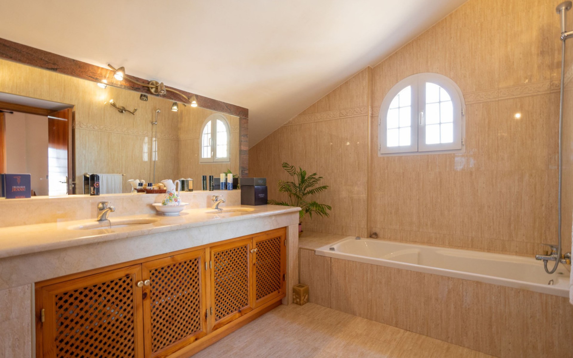 The two bathrooms are large, one bathroom is equipped with a toilet, double sink with commode, shower and bathtub while the other is equipped with a toilet, sink and shower.