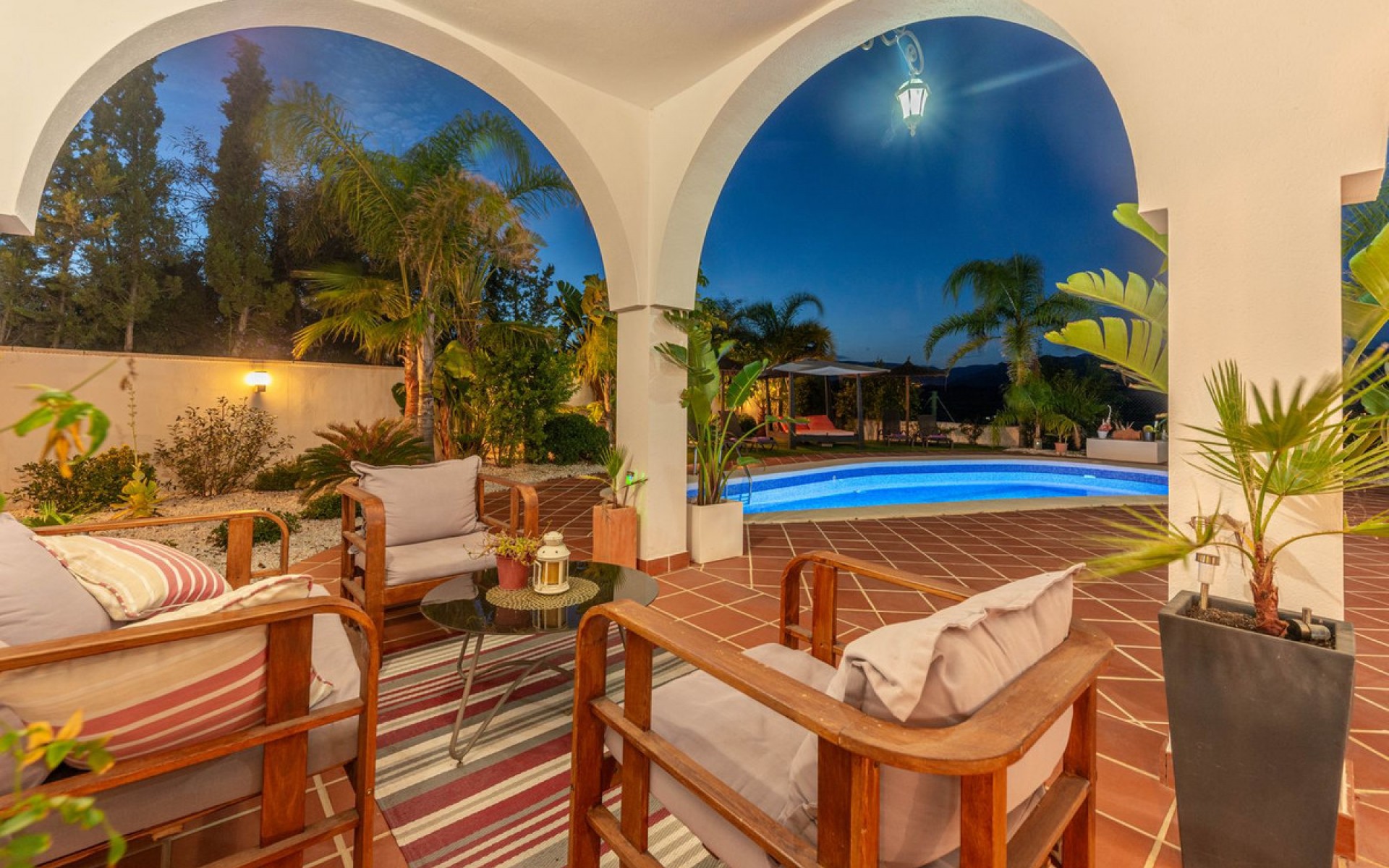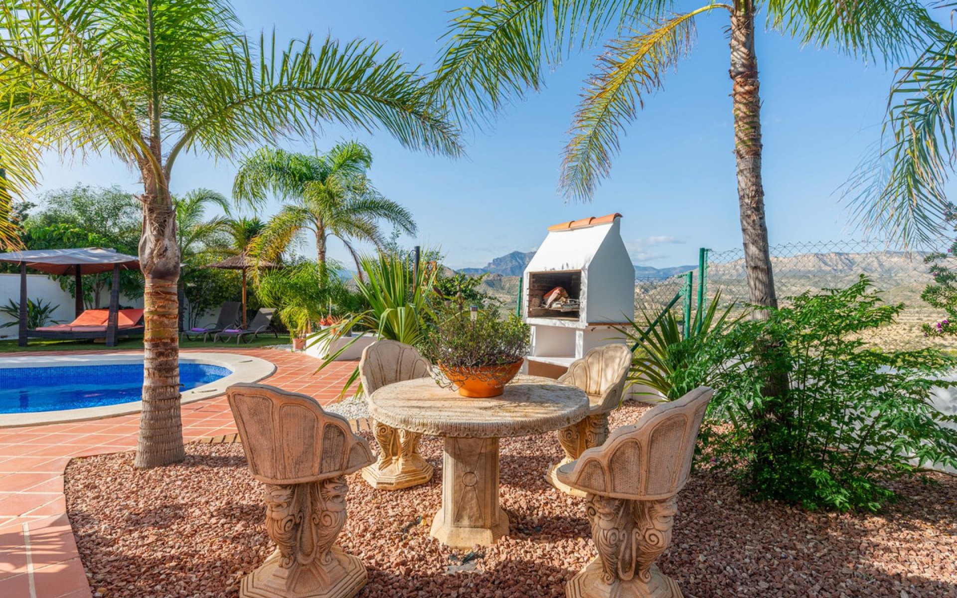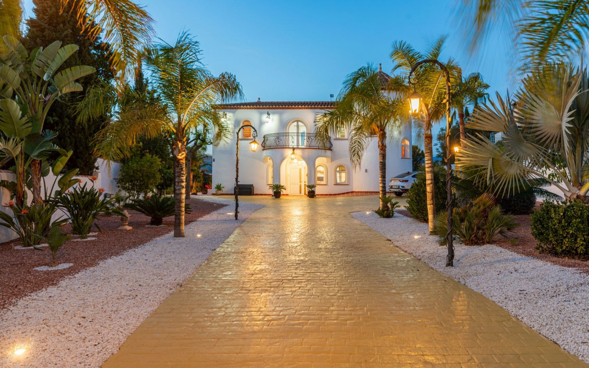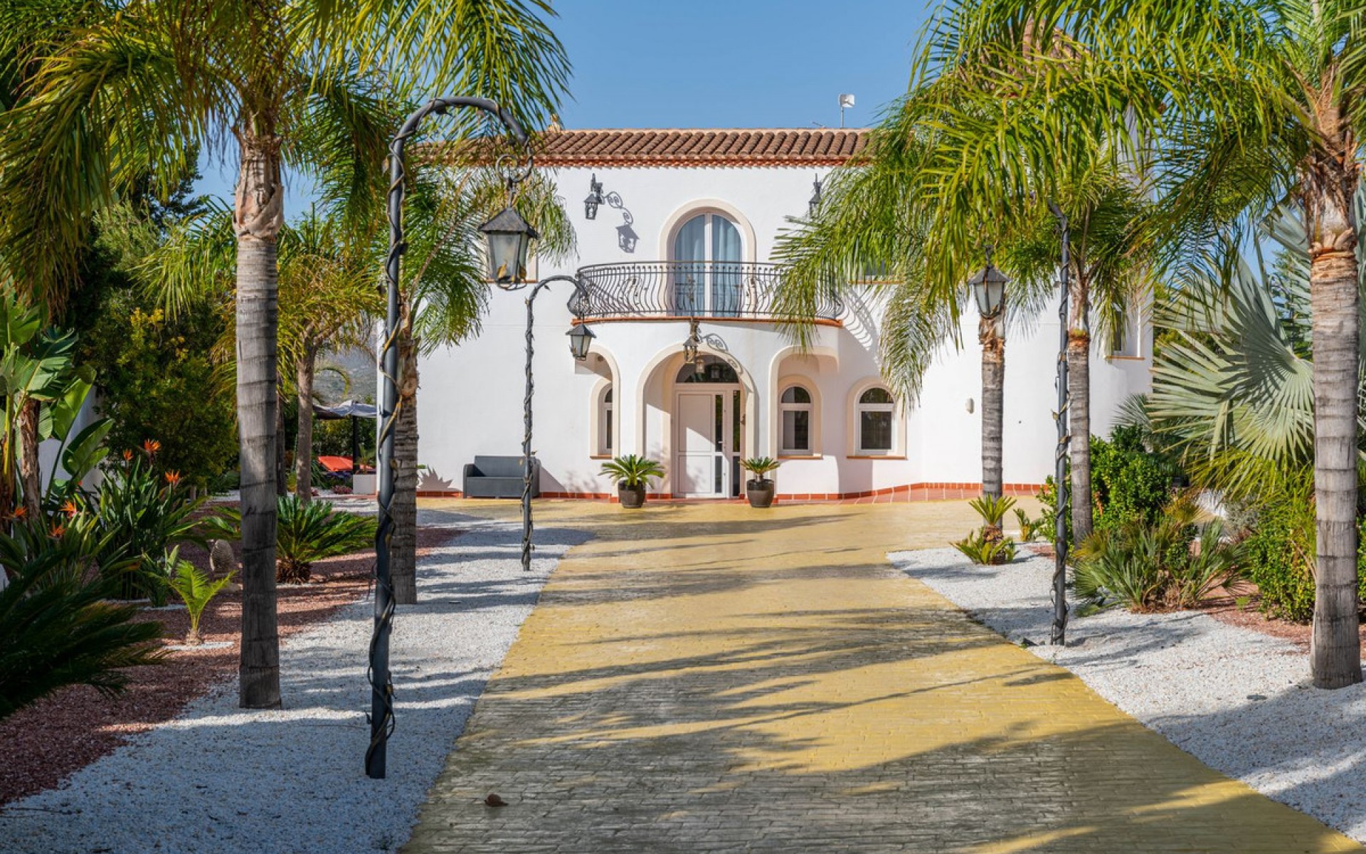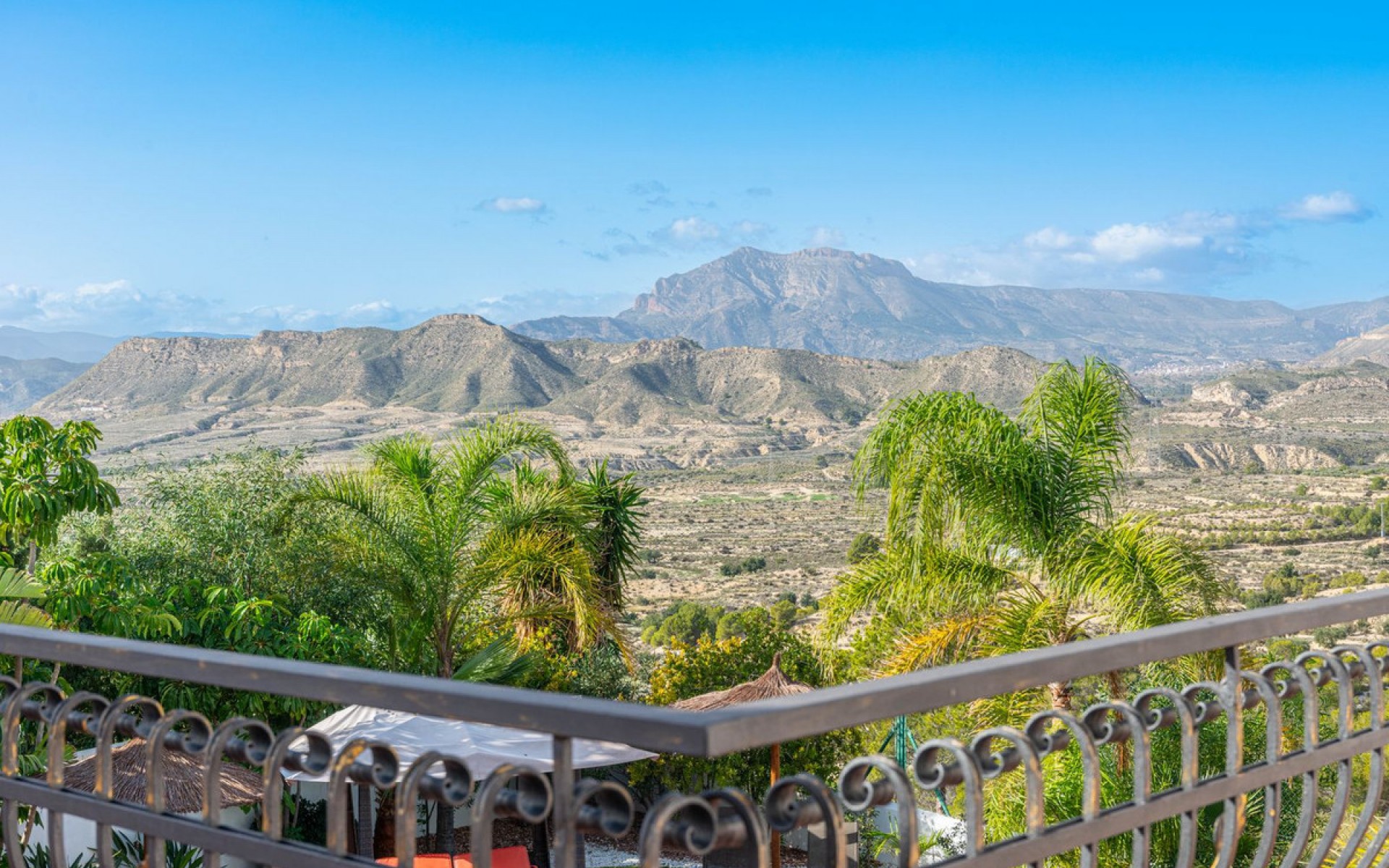 Located in the sought-after Pla Lloma area of Busot, near the charming village of Busot, lies this remarkable residence. Villa "Laura Luiza" is constructed with high-quality noble materials and spans over 350 m². Situated on an exceptionally private plot that exceeds three times its size, this villa enjoys a convenient location just a 10-minute drive from Busot village, 20 minutes from the pristine beaches of El Campello-San Juan, and only 30-35 minutes from Alicante and its international airport. Access to the stunning villa is via a residential road to the ornate hand crafted, automated entrance gates which open up to a long, tree lined drive way leading to the entrance of Villa "Laura Luiza". Villa Laura Luiza combines spacious accommodations, robust construction, stunning exteriors and interiors, breathtaking views, exceptional privacy, and a unique blend of character and charm—qualities rarely found together on the market. Ground Floor: Spacious open-plan lounge, dining, and kitchen area. The kitchen comes fully equipped with white goods. There are two double bedrooms on the ground floor. The master bedroom, generously sized at approximately [23] m², includes an en-suite shower room. A guest toilet is conveniently located next to the second bedroom, near the charming circular turret, which provides access to the second floor. Direct access to the ground floor terraces around the swimming pool area. Upper floor: 4 double suites with en-suite shower rooms on this level. The master bedroom also offers a dressing area and large bathroom with his and hers was basins, shower and bathtub. The 2 larger bedrooms enjoy direct access to a large terrace affording breathtaking views of the mountain range, the swimming pool and gardens. Bedrooms 3 and 4 benefit from their own private balconies. Exteriors: 220m2 swimming pool terrace, very private with open long distance views to the rear. Free-form swimming pool and covered terrace areas and day bed and BBQ. Manicured, landscaped gardens with mature trees terraced, laid to gravel and impressive driveway and impressive exterior lighting. Villa Laura Luiza is ideal for families looking for a permanent residence or investors seeking a high-end property for the luxury holiday rental market.