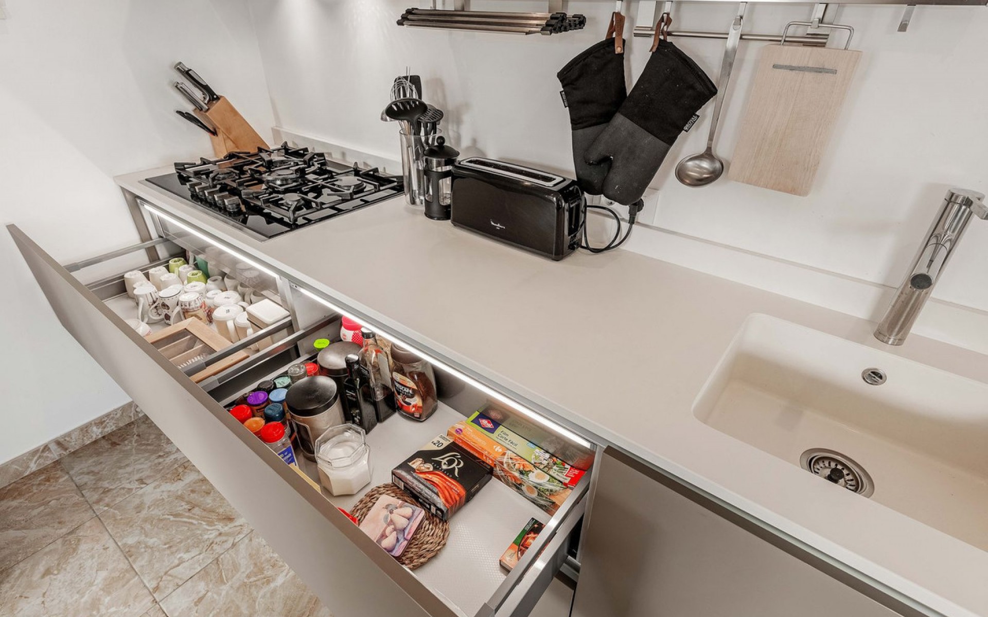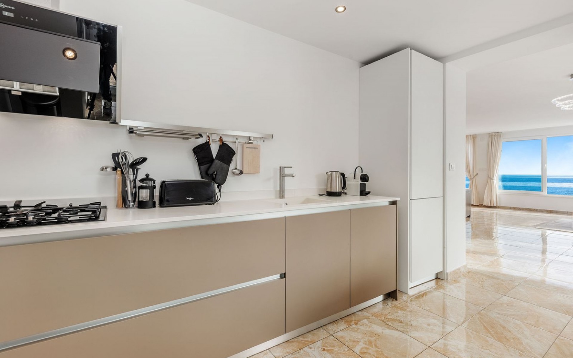 A fully equipped, state-of-the-art kitchen is adjacent to the lounge, featuring high-end appliances—perfect for culinary enthusiasts.
