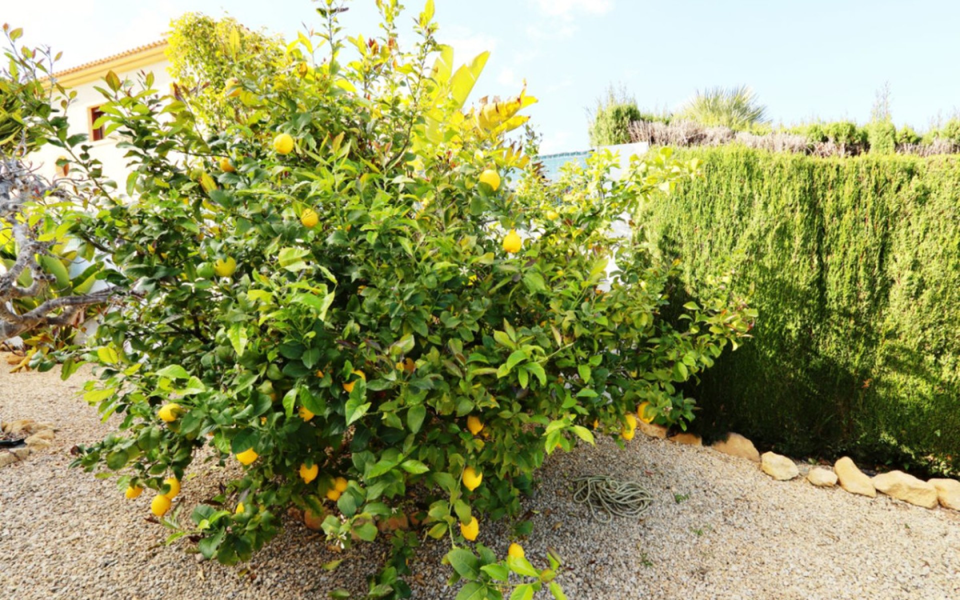 Located in the sought-after area of Bello Horizonte in La Nucia, just outside Altea, this charming family villa is the perfect place to live all year round. The property is distributed over two floors. The main access leads to a large integrated garage and a sunny porch, from which steps lead down to the garden, where you will find orange trees, mature lemon trees and beautiful palm trees. On the entrance level is the master bedroom with en-suite bathroom, a guest toilet, a spacious kitchen, a separate laundry room, and a large living-dining room with fireplace, air conditioning and central heating. Large windows offer spectacular views of the sea, covering Altea, Albir and Calpe. Next to the living room, a stunning terrace with panoramic views becomes the perfect place to enjoy a glass of wine while watching the sunset. The ground floor is accessible from both the inside and the outside, making it an ideal choice for entertaining. This area also has a separate kitchen, as well as 4 more bedrooms (one of them currently fitted out as an art studio), 2 spacious bathrooms and a beautiful terrace overlooking the heated pool area. The low-maintenance gardens, with palm trees, fruit trees and shrubs, create a relaxing atmosphere. The pool is the perfect place to cool off during warm, mild summer nights, and has the added bonus of a poolside Jacuzzi and an outdoor shower. The villa is equipped with solar panels, a battery, a heat pump and an aerothermal energy. Which makes this villa very energy efficient.