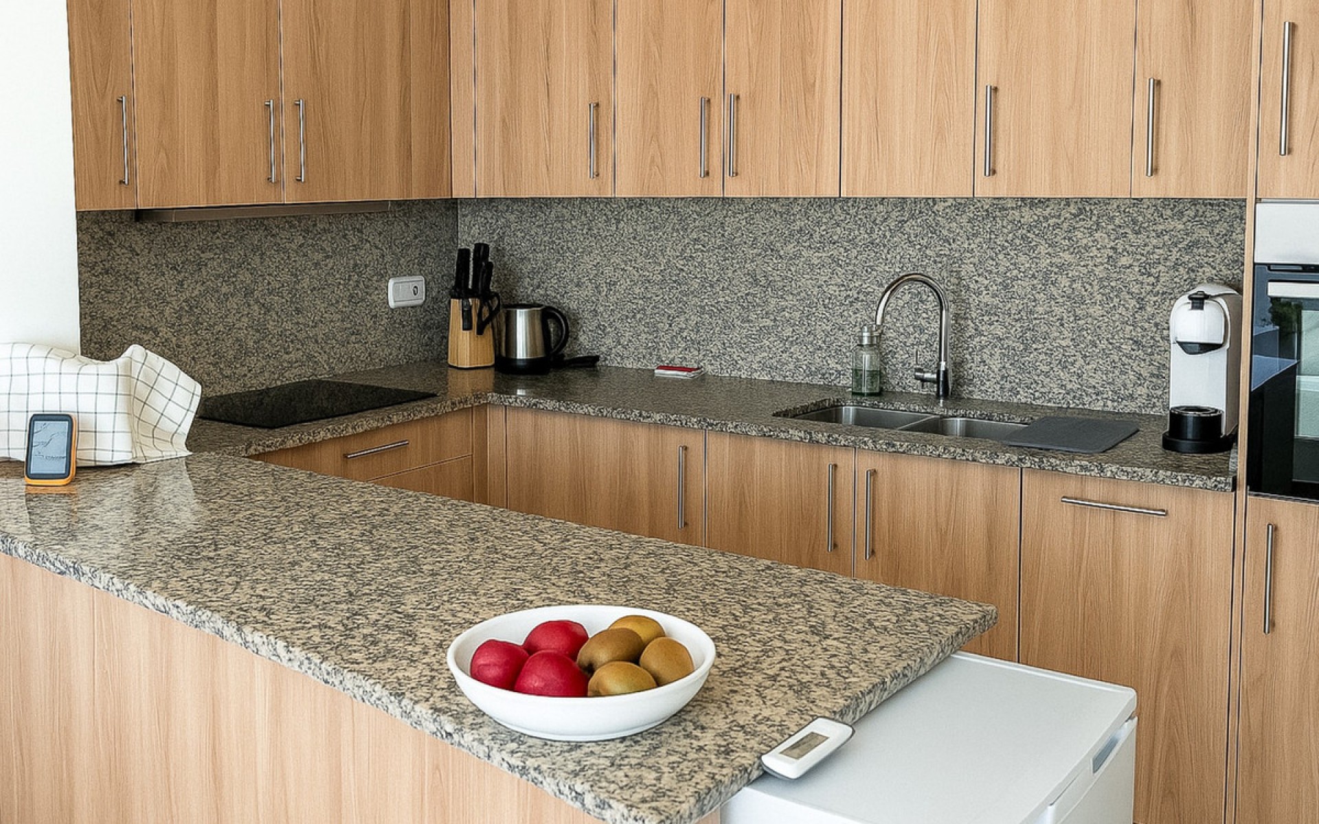 The main house features a spacious living and dining room , adjacent to a fully equipped open-plan kitchen with a dishwasher , oven , Siemens induction hob , and a large refrigerator . The kitchen has direct access to a large 150 m² terrace , ideal for enjoying the Mediterranean climate and the outdoors.