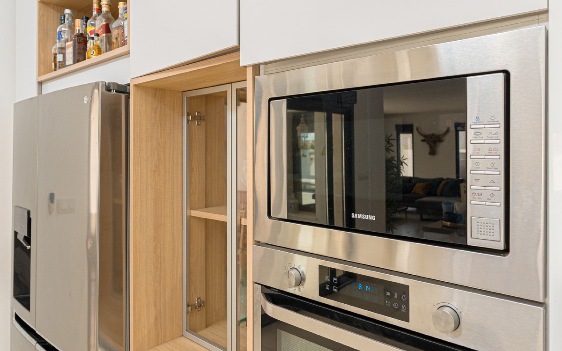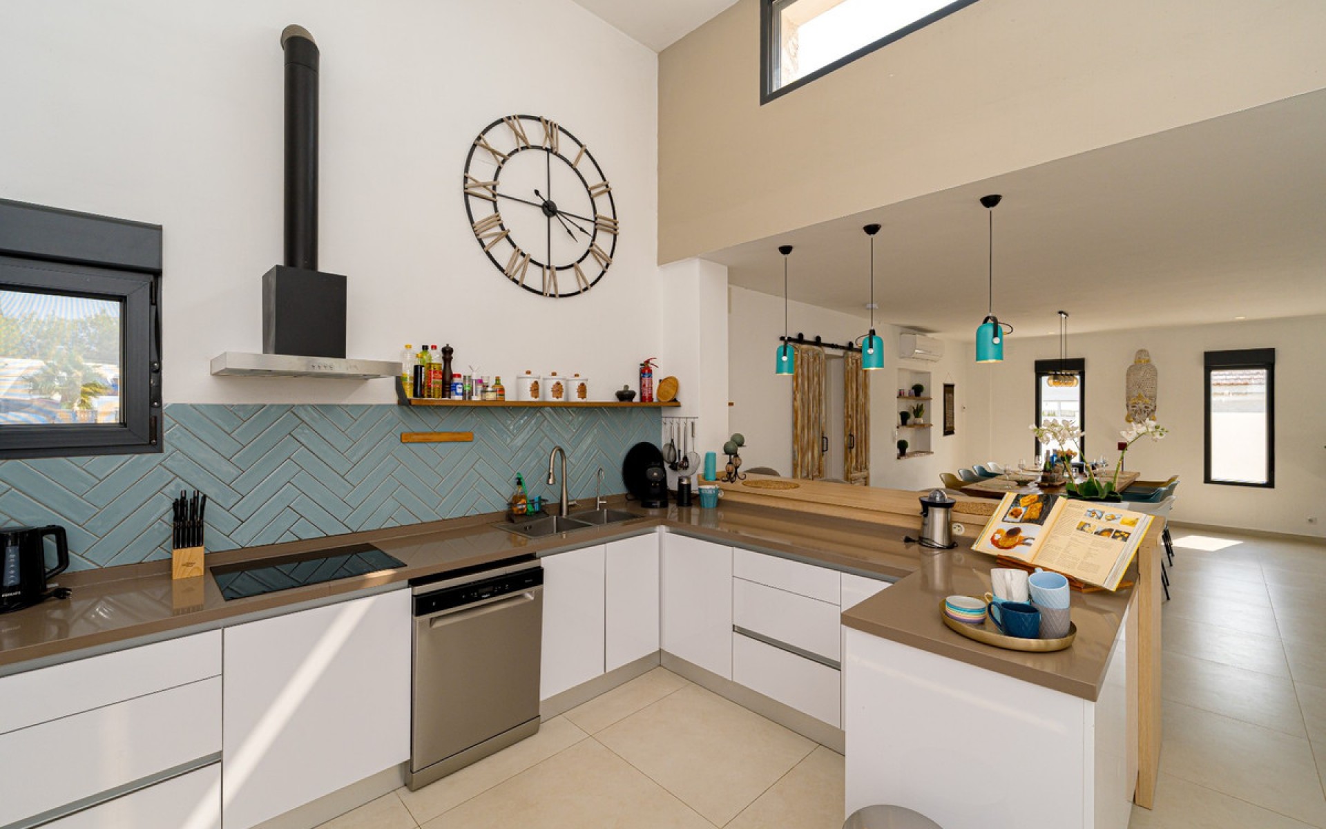 The interior is organized around a spacious entrance hall that leads to an open and bright living area , where a fully equipped modern kitchen is integrated, with white furniture and natural wood, creating a sophisticated and welcoming atmosphere.