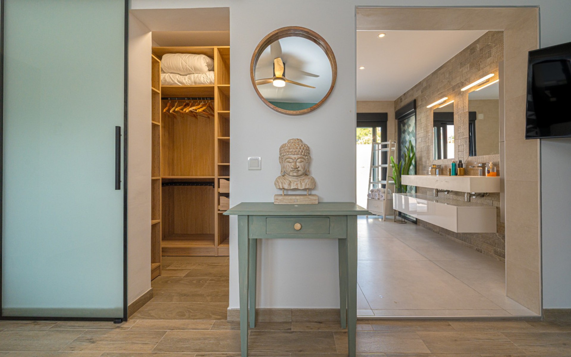 The exterior of the property is a true private oasis designed for enjoyment. It features a large private pool , outdoor shower , jacuzzi , spacious terraces, and a sunbathing area surrounded by palm trees and fruit trees. An elegant Mediterranean-style beach bar with a summer kitchen, barbecue, and storage room , which also includes a full bathroom , completes this perfect space for gatherings and leisure time.