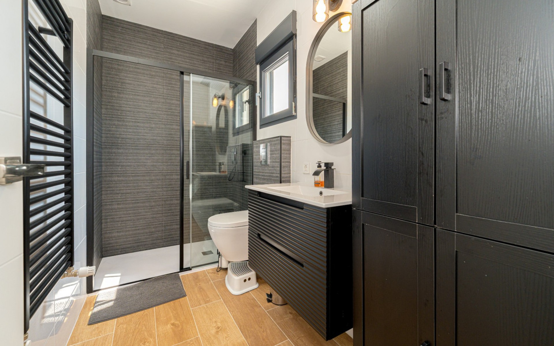 The property stands out for its contemporary architecture and functional layout , featuring 5 bedrooms , 4 full bathrooms , and 1 guest toilet . All rooms enjoy abundant natural light thanks to large windows and high ceilings that create a sense of spaciousness and elegance. Two of the bedrooms and one bathroom have a separate entrance , forming an apartment of approximately 38 m² , ideal as guest accommodation, an office, or a private studio.