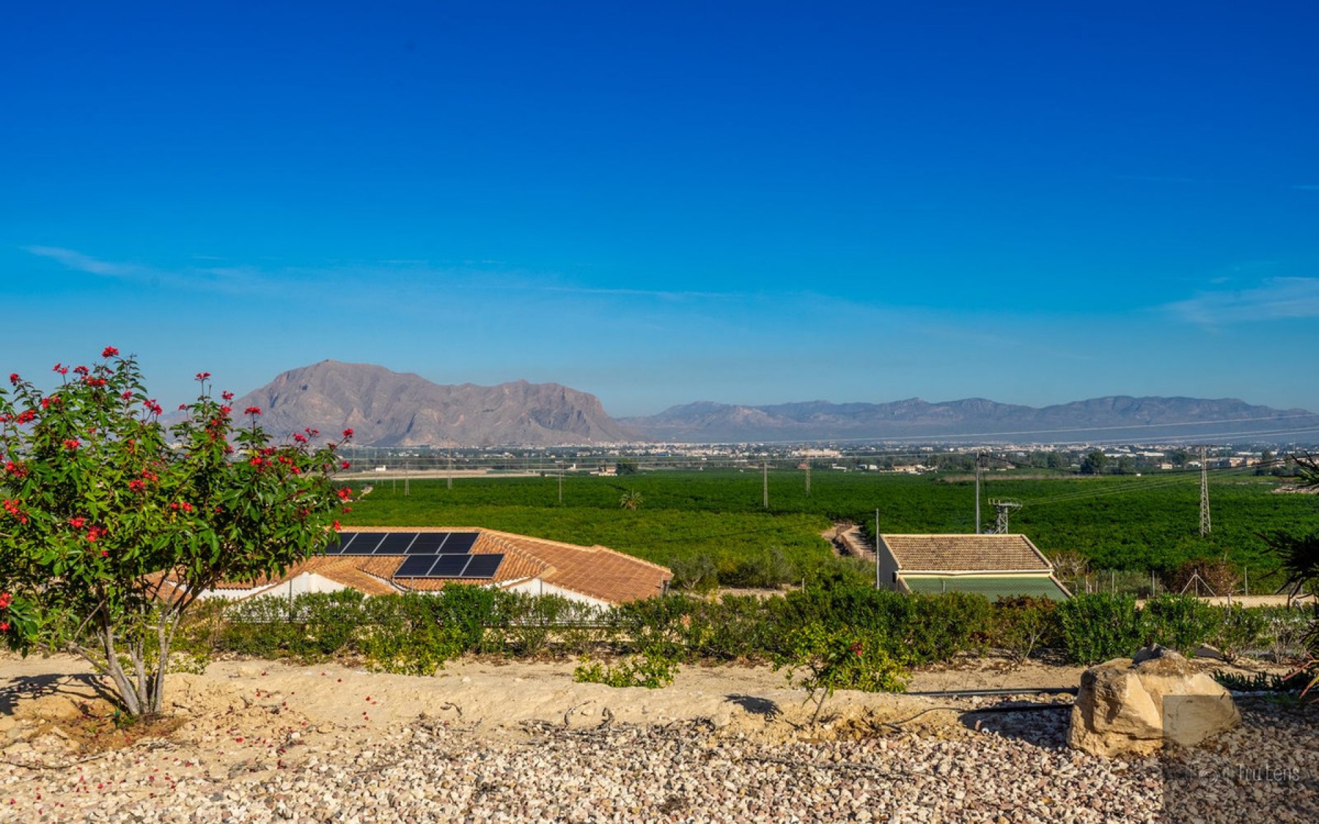This incredible property, based in a proud elevated position and surrounded by lemon groves, offers an enormous plot of 6490m2, with two homes: a main villa offering three bedrooms and two bathrooms, and a self contained annex of one bedroom and one bathroom. Located in a beautiful and private location yet just 3km to the closest town, the property would make the perfect permanent residence or indeed holiday home. The property is located perfectly between a number of busy villages and towns such as Jacarilla, Bigastro and Algorfa and is just 35 minutes from Alicante airport. Enter the plot via electric security gates into a large driveway with garage for two cars. The main residence is entered from the driveway and its elevated front entrance makes for an impressive start to the home. Through the front door can be accessed the ample living, dining and fully refurbished kitchen, with views of the mountains, lemon groves and pool from every window. To the right of the property is a master bedroom with private ensuite, and to the left are two further bigger than double bedrooms and a family bathroom. The kitchen is fully equipped and also enjoys access to a pantry. Access to the pool area is via patio doors directly from the dining room, from here there is an elevated patio and stairs down to the gardens and pool. The separate annex, which can be accessed completely separately offers a large master, living room, fully equipped kitchen and large family bathroom. It enjoys incredible views thanks to its uninterrupted glass patio doors which look over the pool and mountains to the distance. The outdoor space is almost endless and has been incredibly well maintained, offering both sunny and shady spaces to dine, sunbathe, exercise and socialise. The spaces are complemented by mature plants and fruit trees. The saltwater pool, measuring 10 x 5, sits proudly in the centre of the main garden. There is an additional plot, currently used as an orchard, which offers more possibilities to construct further living space, workspace or to expand the current gardens. The property also enjoys an underbuild which is currently used as a workshop and gym. Both properties offer central heating and air conditioning throughout. They also enjoy use of solar panels, which produce an excess of energy to run both properties, meaning that the only cost for electricity is connection of approximately 30 euros per month. The property can be sold completely furnished, as seen, by further negotiation. - Large Plot - Private but Accessible Location - Main Residence - Annex - Completely Refurbished - Solar Panels - Private Pool - Possibilities to Further Expand